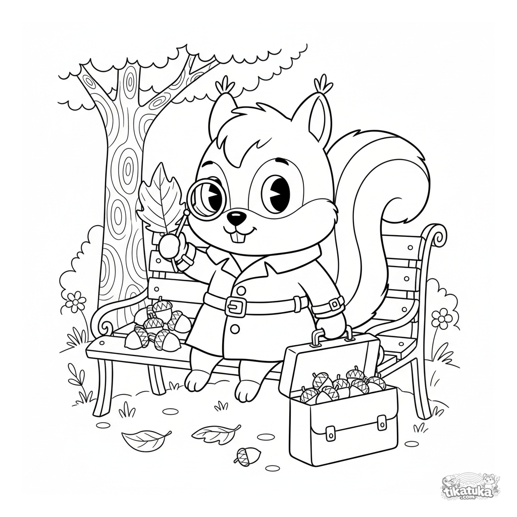 Ausmalbild im Retro-Stil: Ein verdächtiges Eichhörnchen im Trenchcoat mit Monokel auf einer Parkbank untersucht ein Blatt. Absurdes und detailliertes Meme für Kinder 10-12.