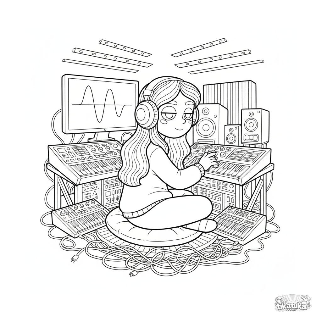 Ausmalbild für Tweens: Ein Elektromusik-Produzent in einem Kellerstudio, umgeben von Synthesizern. Dynamische Szene mit Reglern und Kabeln.