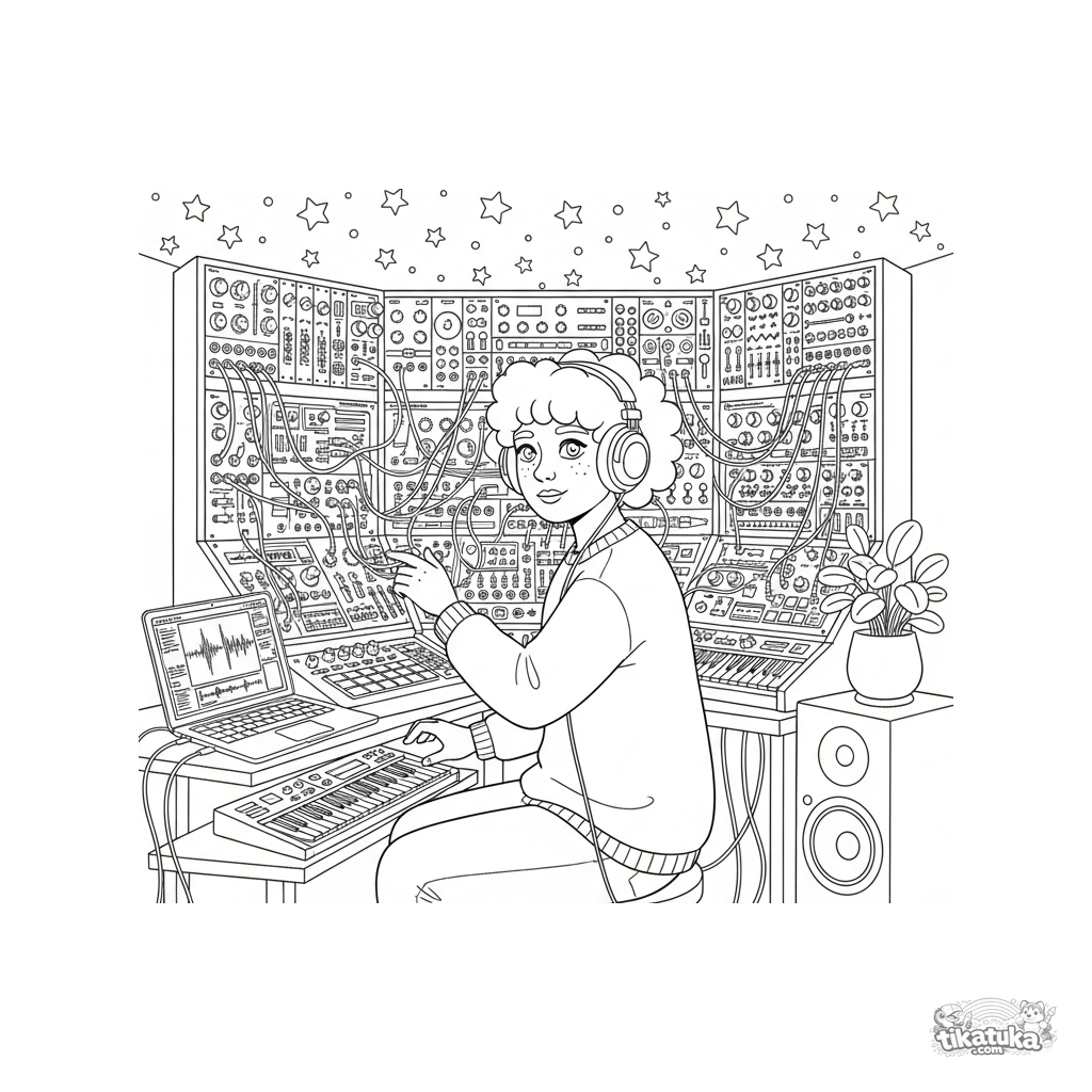 Ausmalbild für Kinder von 10-12 Jahren: ein Elektromusik-Produzent macht einen Track im Keller-Studio. Details: modularer Synthesizer, Patch-Kabel, Laptop, Leuchtsterne. Realistischer Feldzeichnungs-Stil.