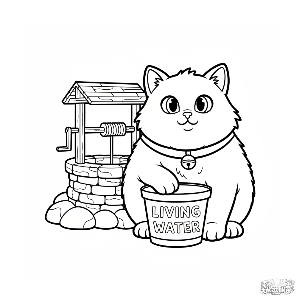 Kleinkind Ausmalbild 2-3: Eine große flauschige sprechende Katzenwächterin steht an einem Brunnen mit lebendigem Wasser. Einfache große Formen, klare Umrisse.