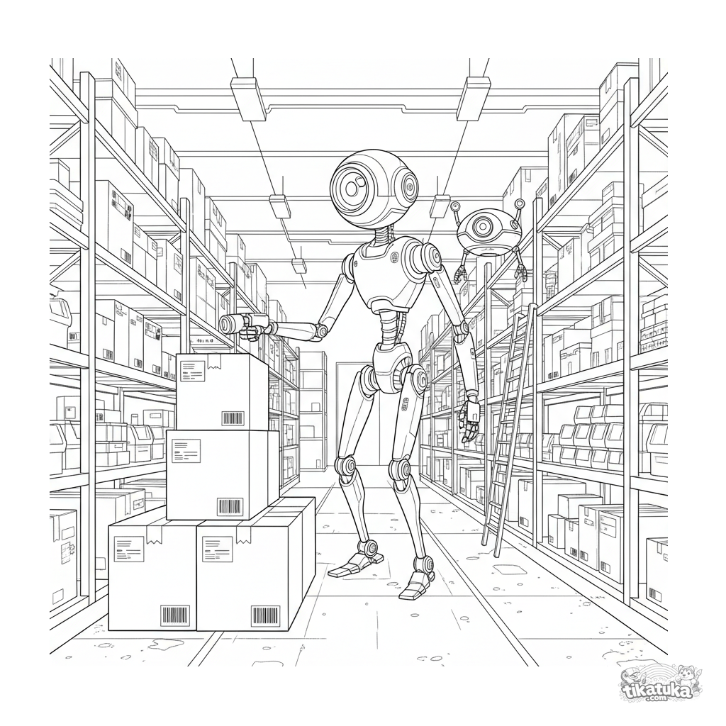 Ausmalbild eines großen Scanner-Roboters, der Kisten in einem Lagerhausgang überprüft. Für ältere Kinder von 10 bis 12 Jahren.