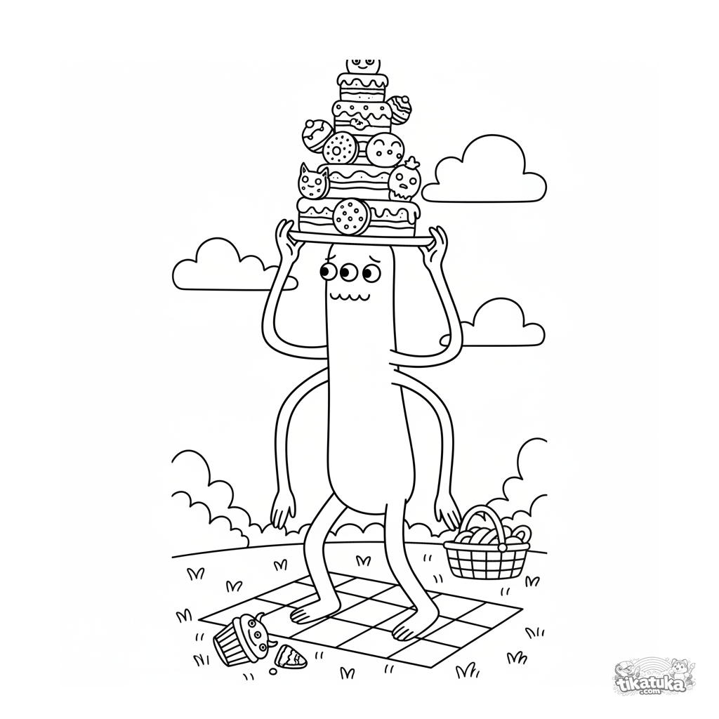 Ausmalbild für Kinder 7-9: Ein großes, dünnes Monster balanciert einen Turm aus Kuchen auf dem Kopf bei einem Picknick. Lustige, dynamische Szene.
