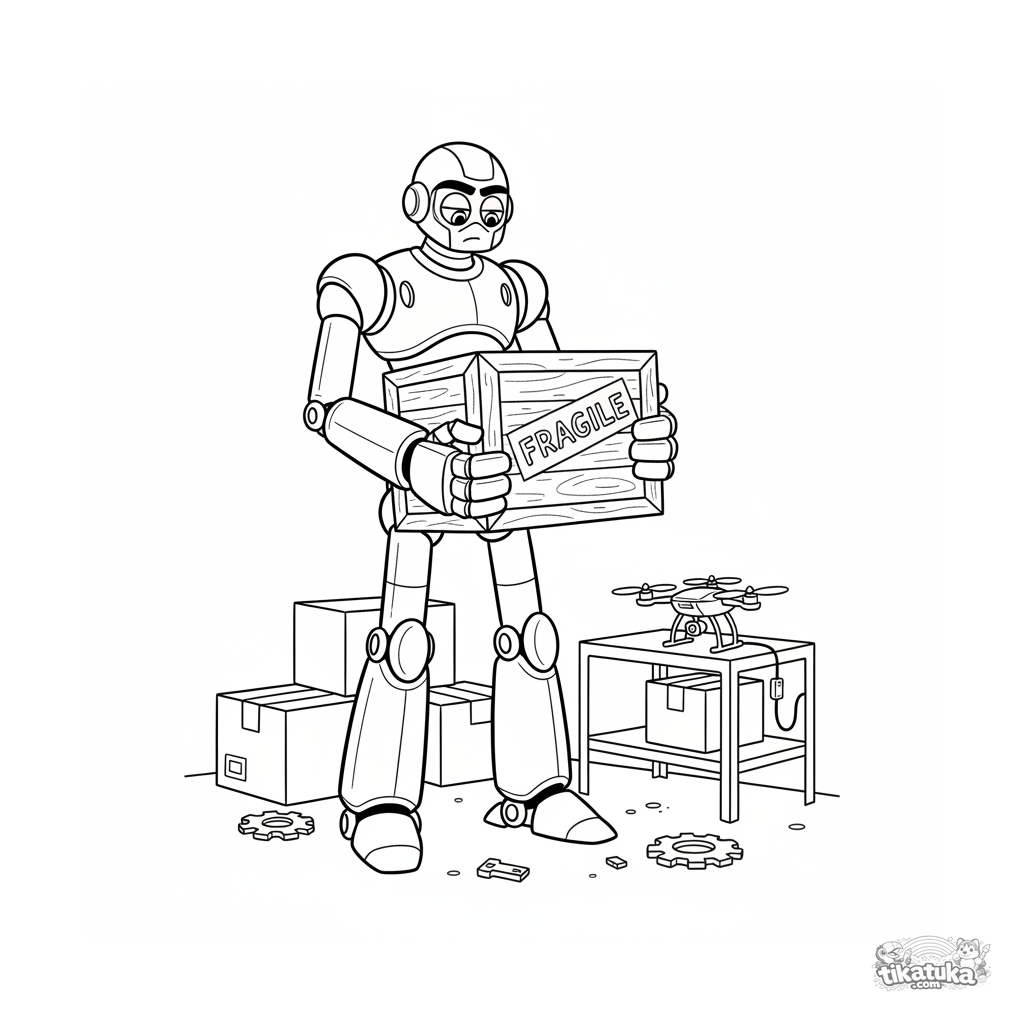 Ausmalbild für Kinder 7-9: Ein kraftvoller Mech-Roboter hebt eine Kiste in einem Lager. Dynamische Pose, hydraulische Details.