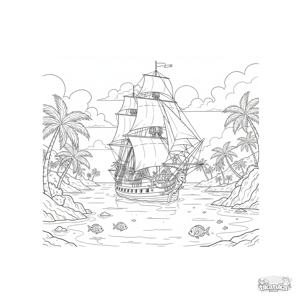 Ausmalbild für Ältere 10-12 Jahre: ein detailliertes Dreimast-Großsegler segelt in eine klare tropische Bucht mit Palmen. Seeleute im Takelwerk, reiche Ankunftsszene.