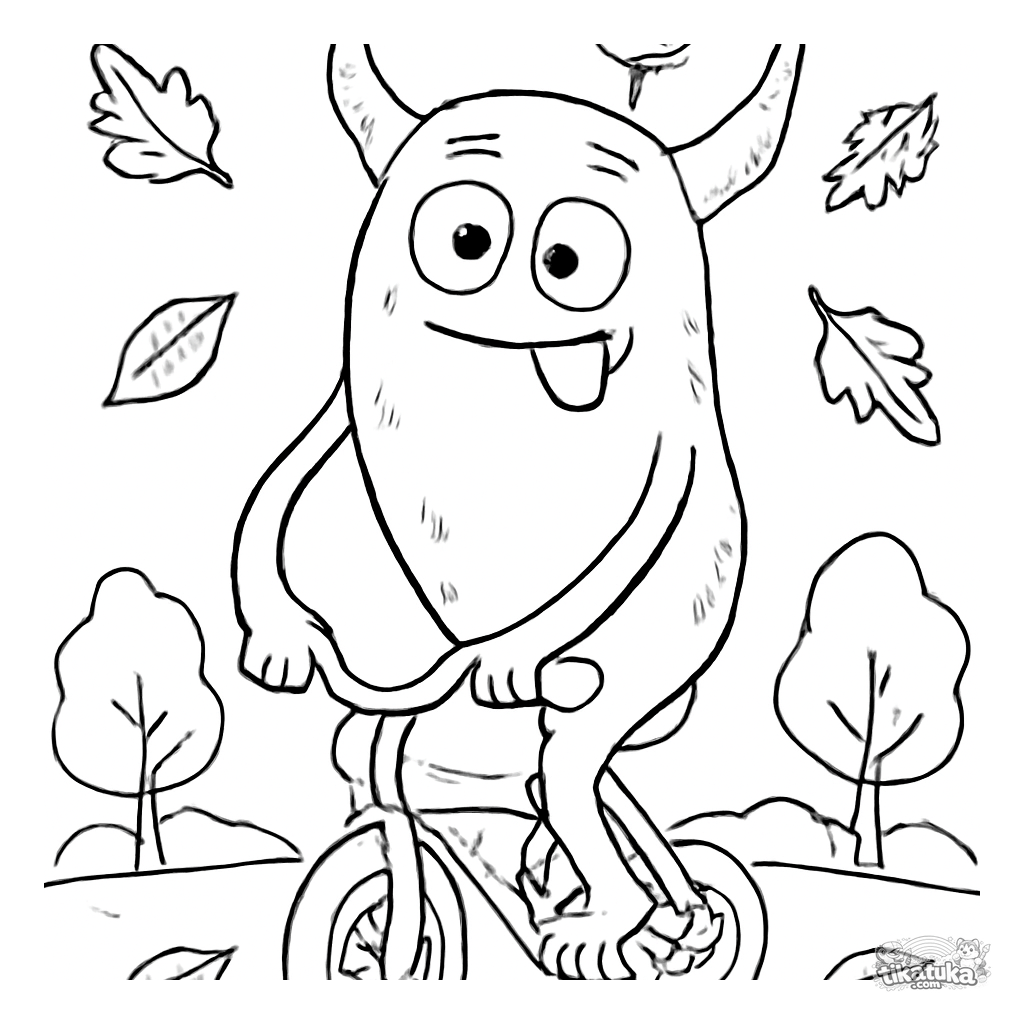 Ausmalbild eines großen Monsters, das in einem Herbstpark Fahrradfahren lernt. Für Kinder von 5-8 Jahren.
