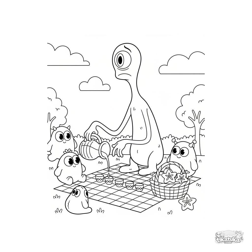 Ausmalbild eines großen, wackeligen Monsters, das auf einem Picknick Saft einschenkt. Für Kinder von 7-9 Jahren. Freundliche Szene mit Monstern und Süßigkeiten.