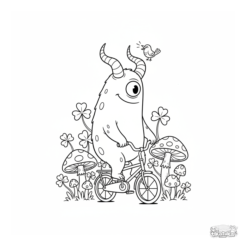 Ausmalbild für Kinder: Ein großes Monster mit Spiralhörnern lernt Fahrradfahren auf einem Pilzfeld. Eine lustige, freundliche Szene über Freundschaft.