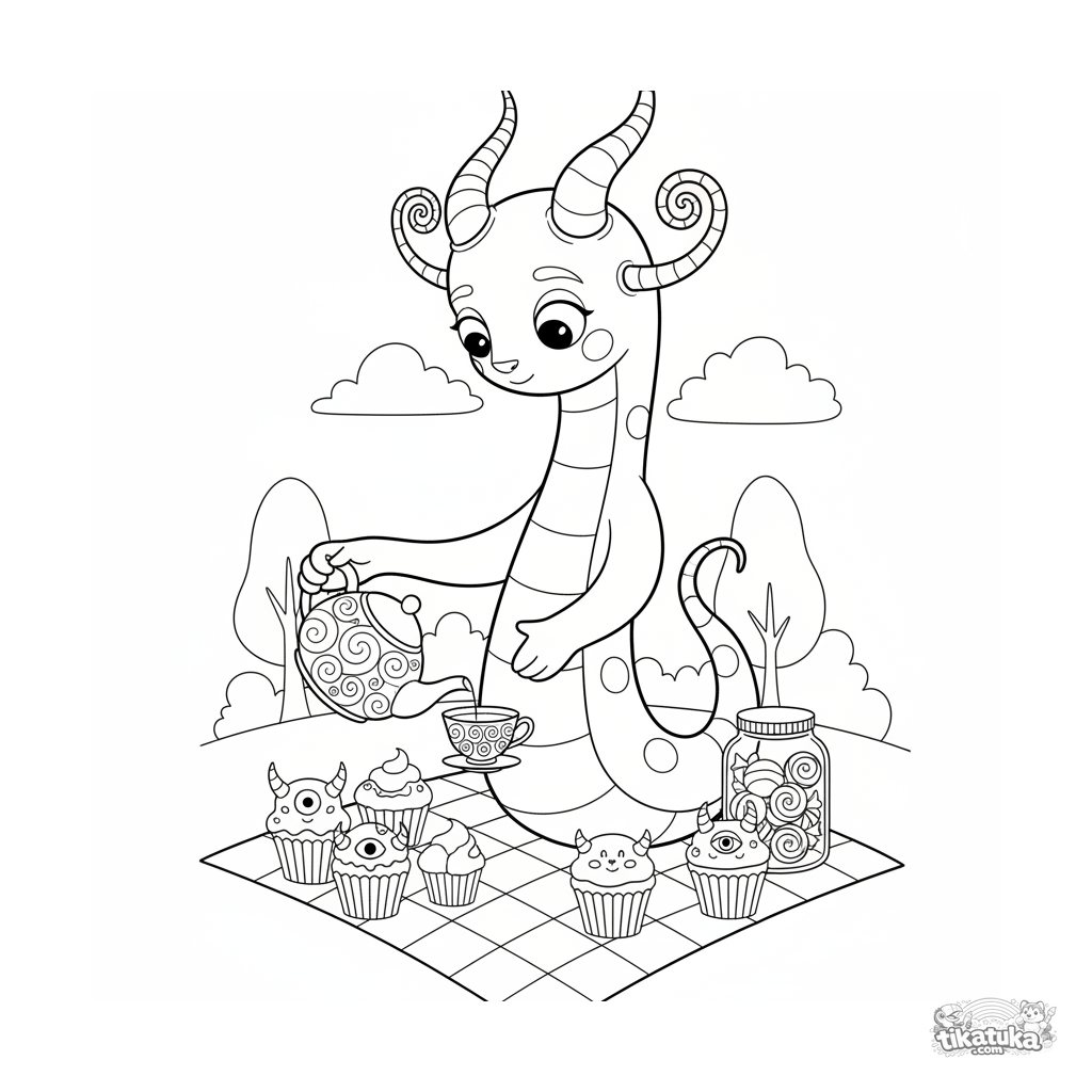 Ausmalbild eines großen Monsters, das auf einem Picknick mit Monstersüßigkeiten Tee einschenkt. Für Kinder von 7-9 Jahren.