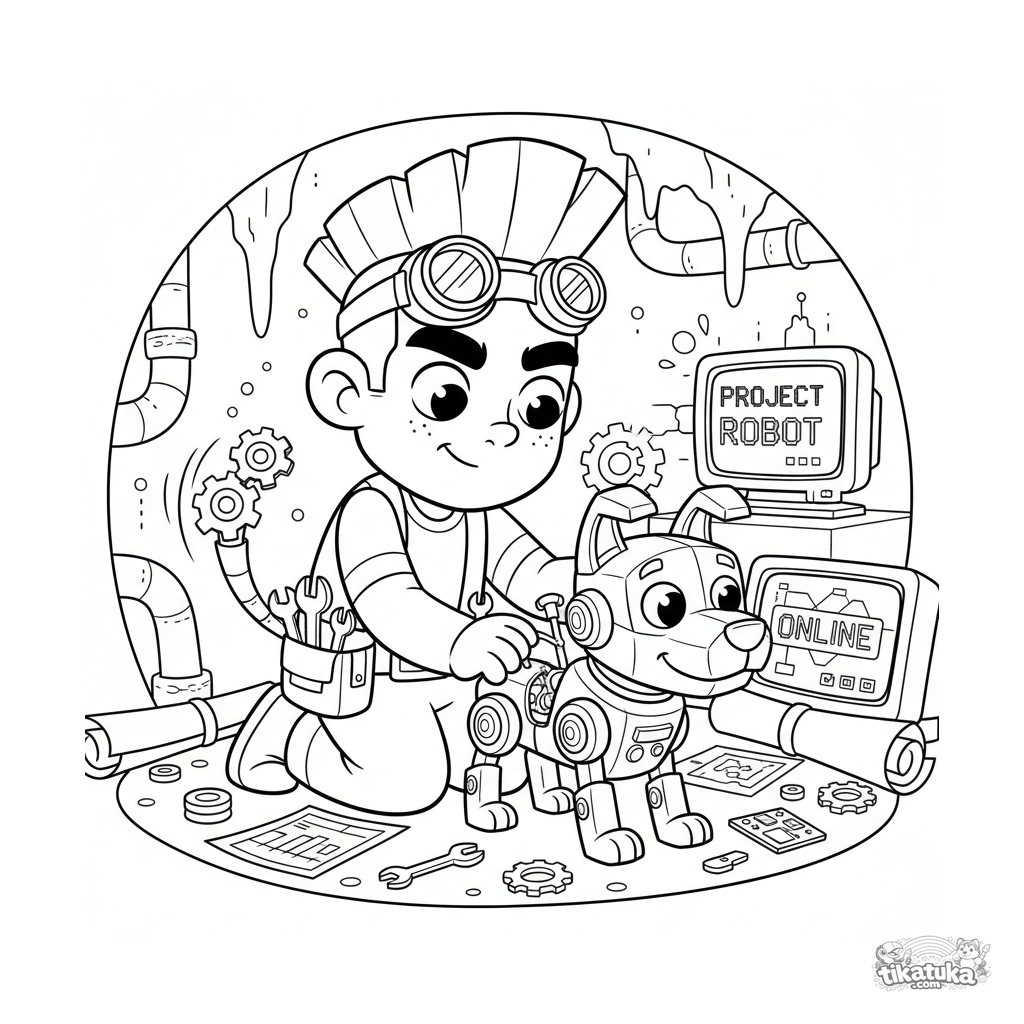 Ausmalbild für Tweens 7-9: Ein Tech-Erfinderheld mit Werkzeugen repariert seinen treuen Roboterhund in einem geheimen Untergrundlabor.
