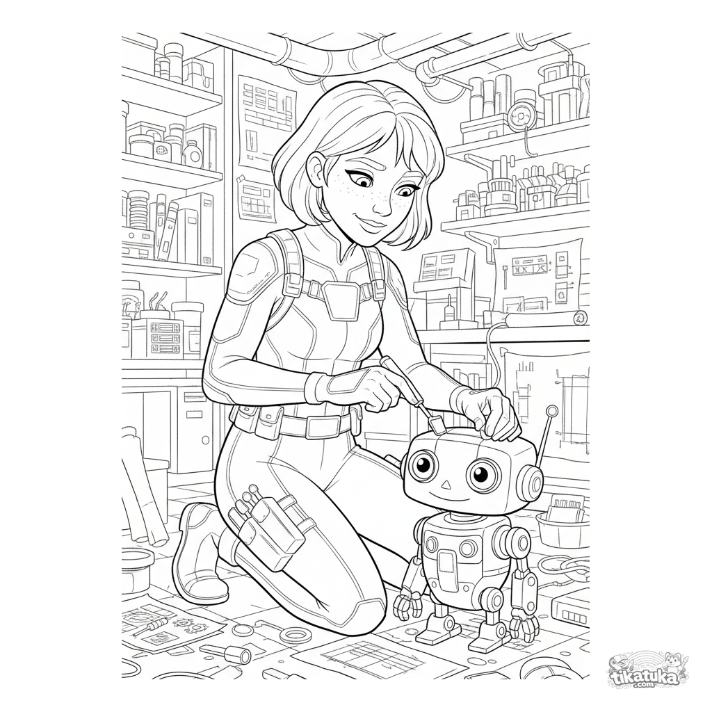 Ausmalbild für Tweens 7-9: Ein Tech-Erfinderheld repariert einen kleinen Roboter in einem unordentlichen Untergrundlabor voller Teile.