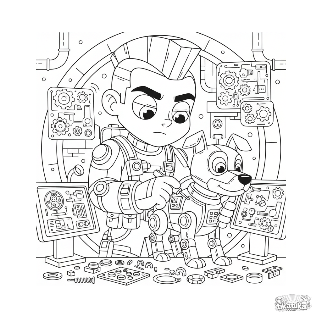 Ausmalbild für 10-12 Jahre: Ein Tech-Erfinder-Superheld mit Werkzeugen repariert einen Roboterhund in einem Untergrundlabor, umgeben von holographischen Schaltplänen.