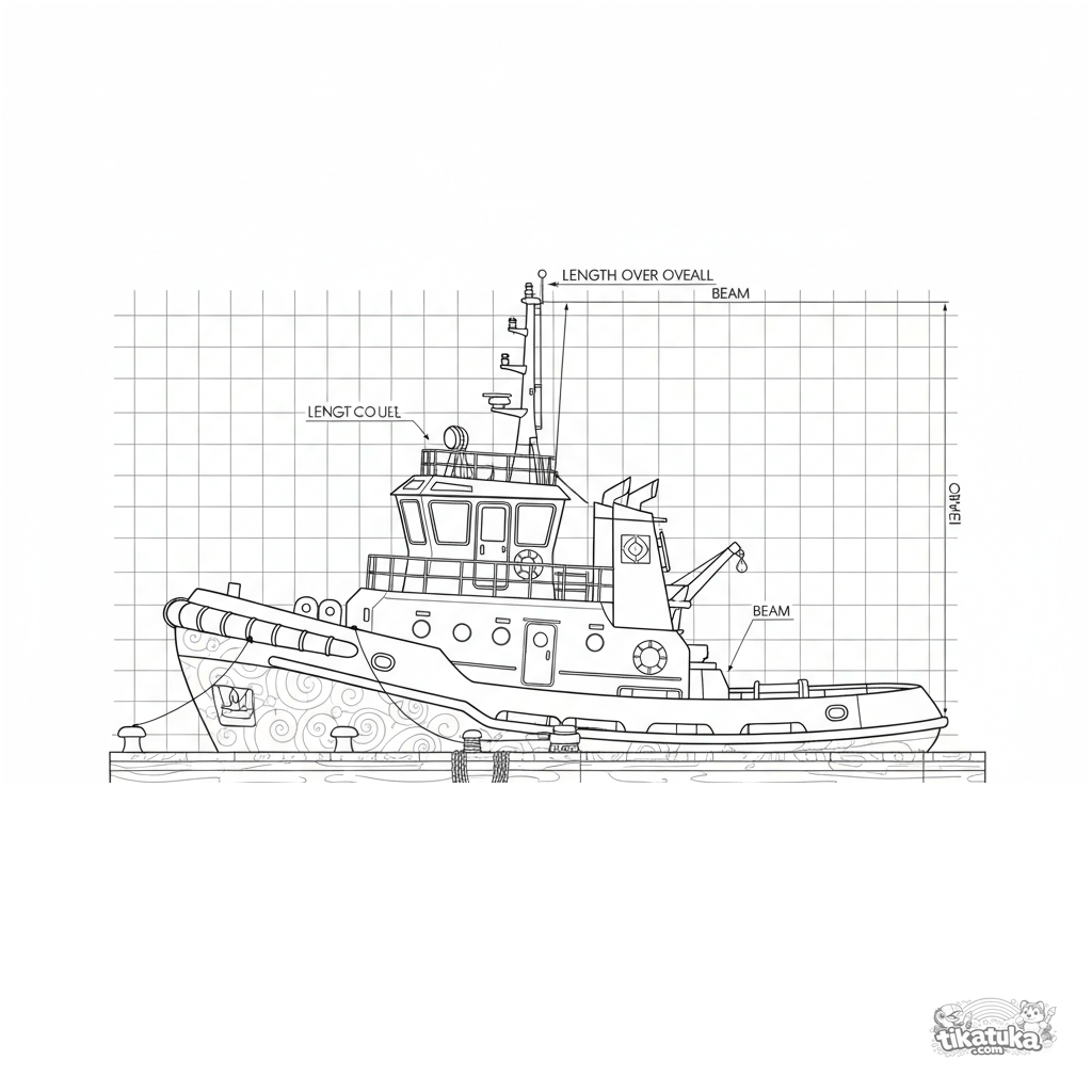 Detailliertes Ausmalbild im Blaupausen-Stil für ältere Kinder 10-12: Eine technische Seitenansicht eines im Hafen anlegenden Schleppers mit Rasterlinien und Maßangaben.