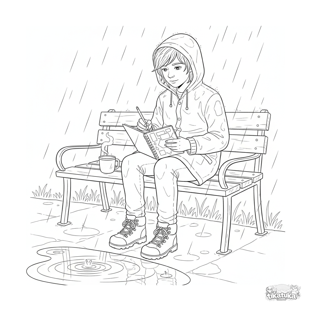 Detailliertes Ausmalbild für Kinder 10-12: Ein Jugendlicher in Regenjacke zeichnet in einem Notizbuch auf einer Parkbank im Herbstregen.