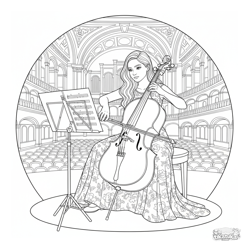 Detailliertes Ausmalbild für 10-12-Jährige: Eine Teenager-Cellistin im Konzertkleid spielt Musik auf einer Konzerthallenbühne im Rampenlicht.