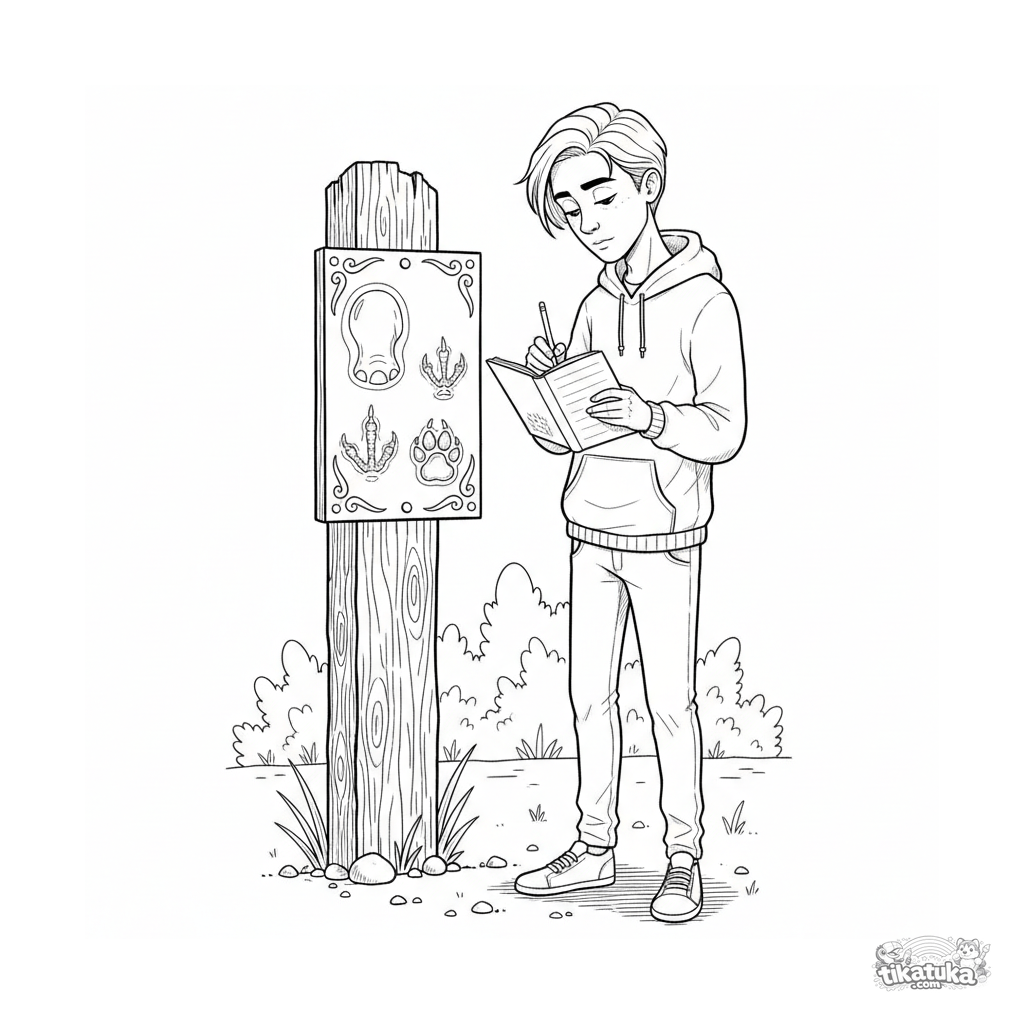 Ausmalbild für 10-12 Jahre: Ein Jugendlicher vergleicht verschiedene Tier-Spuren auf einer Entdecker-Tafel im Zoo. Detaillierte Lehrszene über Beobachtung und Wissenschaft.