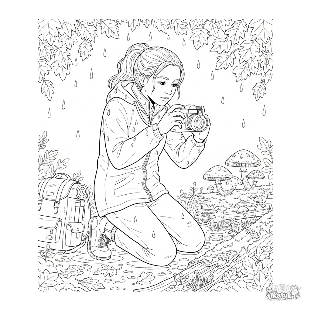 Ausmalbild für ältere Kinder 10-12: ein Teenager in Regenkleidung fotografiert Pilze auf einem moosigen Baumstumpf im Herbstwaldregen. Feldhandbuch-Detail, Texturen.
