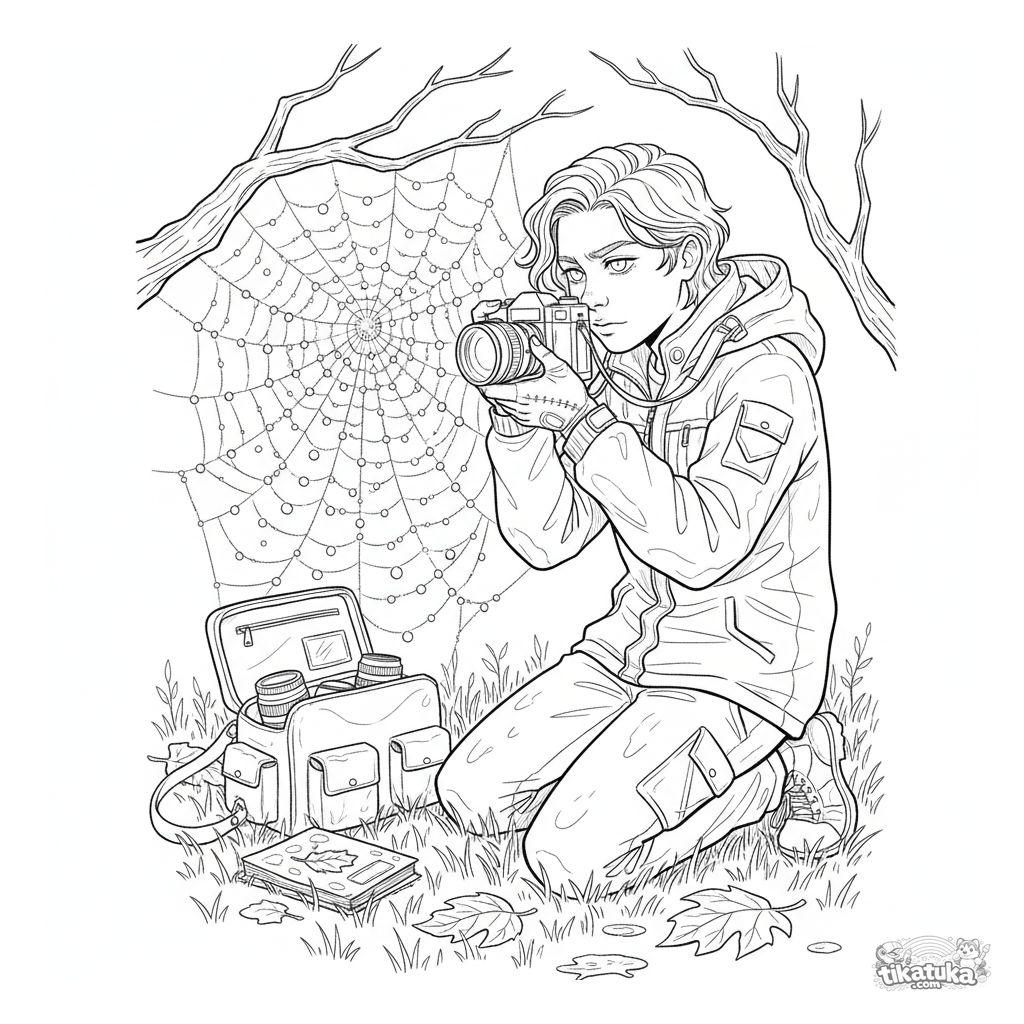 Ausmalbild für ältere Kinder 10-12 Jahre: ein jugendlicher Fotograf hält Regentropfen auf einem Spinnennetz fest. Detaillierte Urban-Sketch-Szene, hohe Komplexität.