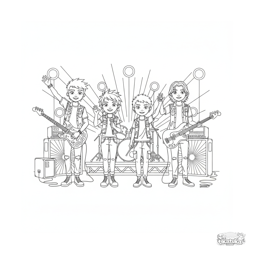 Detailliertes Ausmalbild für 10-12 Jahre: Eine Teenie-Rockband verneigt sich auf einer großen Bühne. Mit Gitarre, Mikrofon, Schlagzeug.