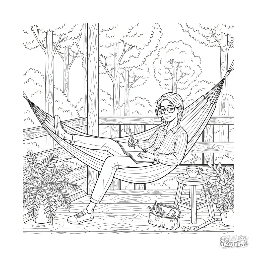 Detailliertes Ausmalbild für Kinder 10-12: Ein Teenager skizziert in einem Notizbuch, während er in einer Hängematte auf der Veranda liegt.