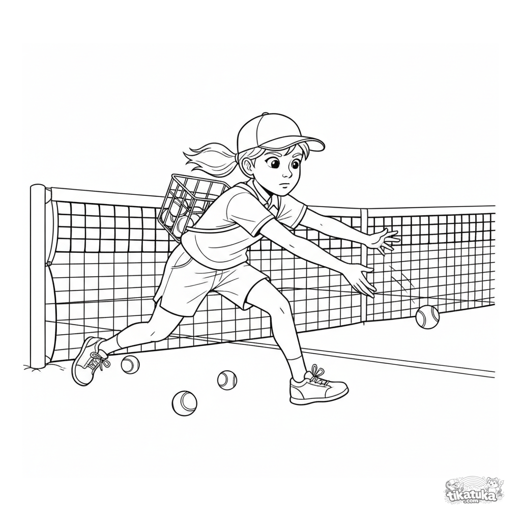 Ausmalbild für 7-9 Jahre: ein Balljunge in Uniform fängt einen verirrten Tennisball in Netznähe. Eine Szene hinter den Kulissen des Spiels.