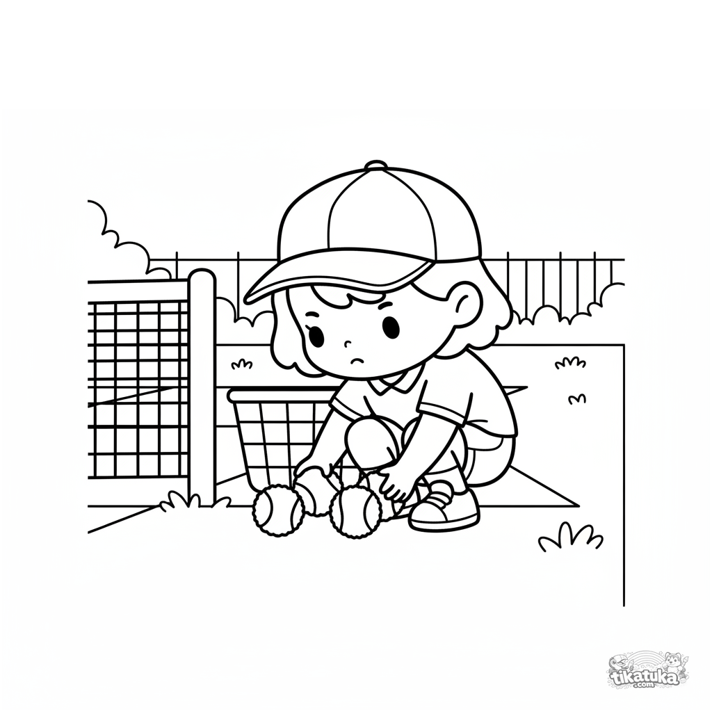 Ausmalbild für Kinder 4-6 Jahre: junger Helfer auf Tennisplatz ordnet Bälle an. Lustiger Stil, klare Formen.