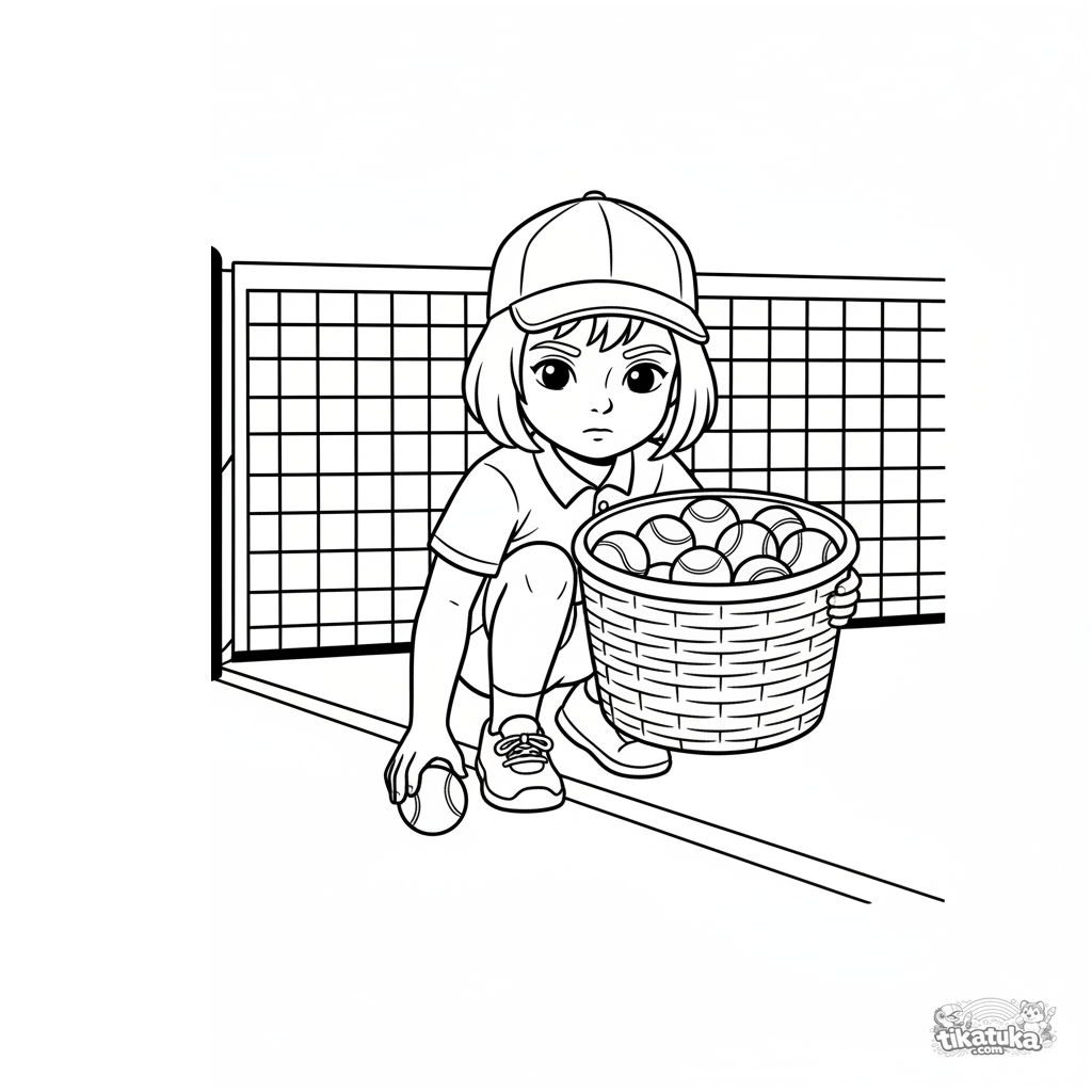 Ausmalbild für Kinder von 7-9 Jahren: Ein Balljunge auf einem Tennisplatz mit einem Korb voller Bälle. Szene zeigt eine wichtige, aber weniger sichtbare Rolle.