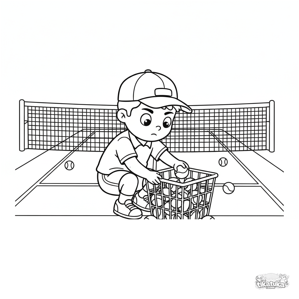 Ausmalbild für Kinder 7-9: Ein Balljunge mit Kappe sammelt verstreute Tennisbälle in einen Korb. Szene zeigt wichtige Arbeit hinter den Kulissen.