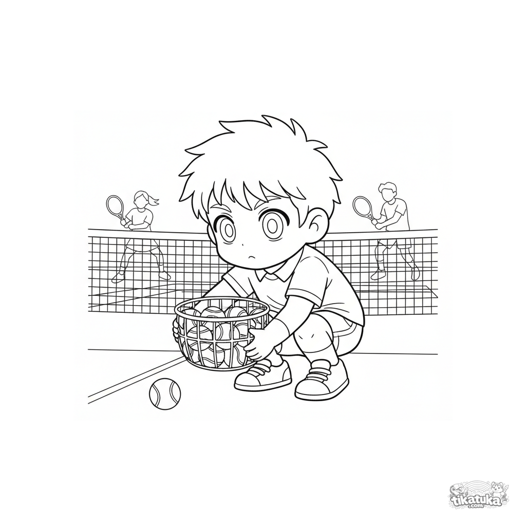 Ausmalbild für Kinder 7-9: ein aufmerksamer Balljunge am Platzrand bereitet sich vor. Dynamische Wartepose.