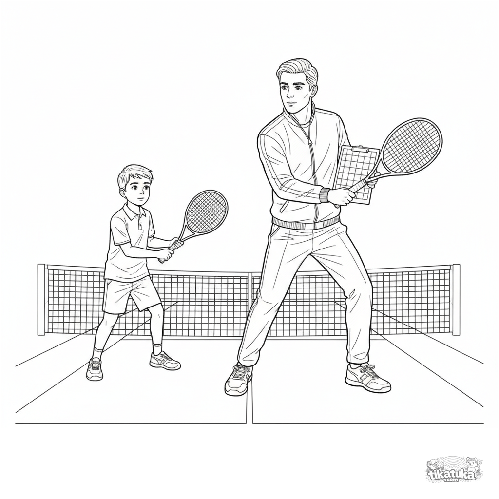 Detailliertes Ausmalbild für Kinder von 10-12 Jahren: Ein Tennistrainer demonstriert einem Schüler auf dem Platz die Rückhandtechnik.