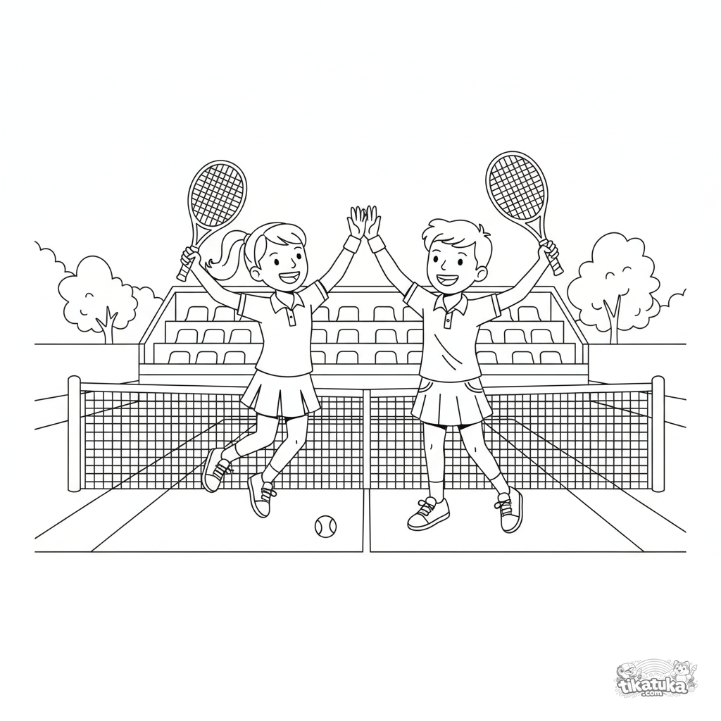 Ausmalbild für Kinder 7-9: ein Tennis-Doppelteam feiert einen gewonnenen Punkt am Netz. Szene der Interaktion und Freude.