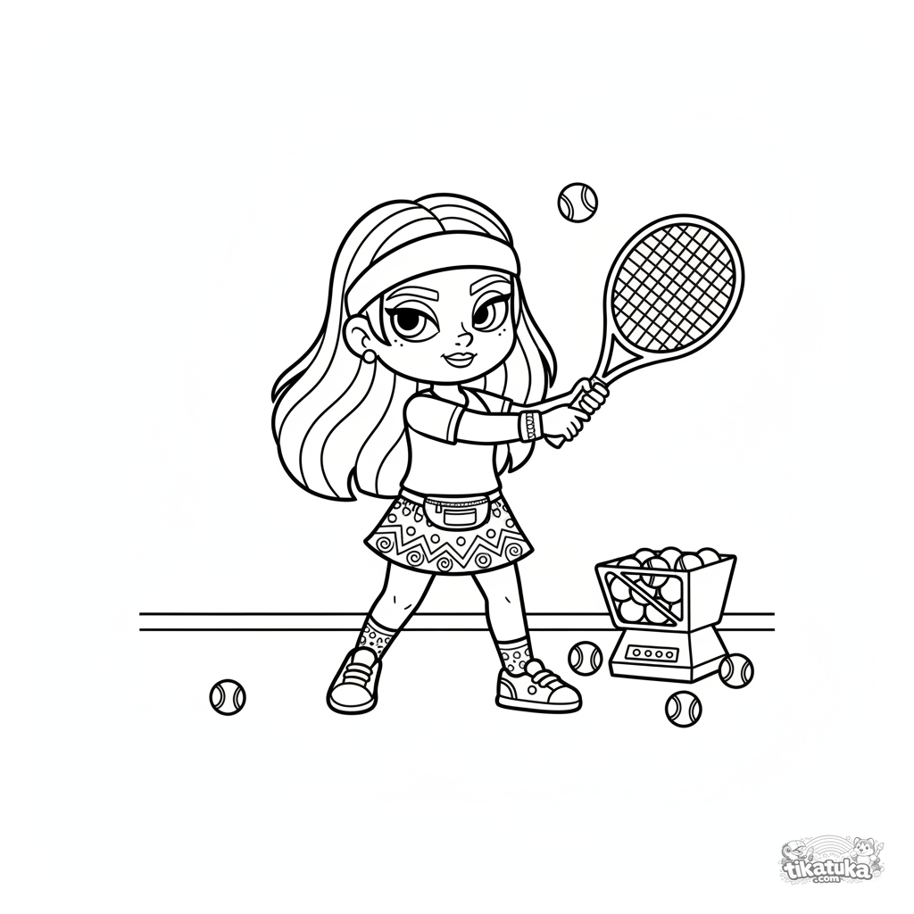Detailliertes Ausmalbild für ältere Kinder 10-12: ein Tennisspieler trainiert fleißig seinen Aufschlag, eine Ballmaschine steht daneben. Solotrainingsszene.