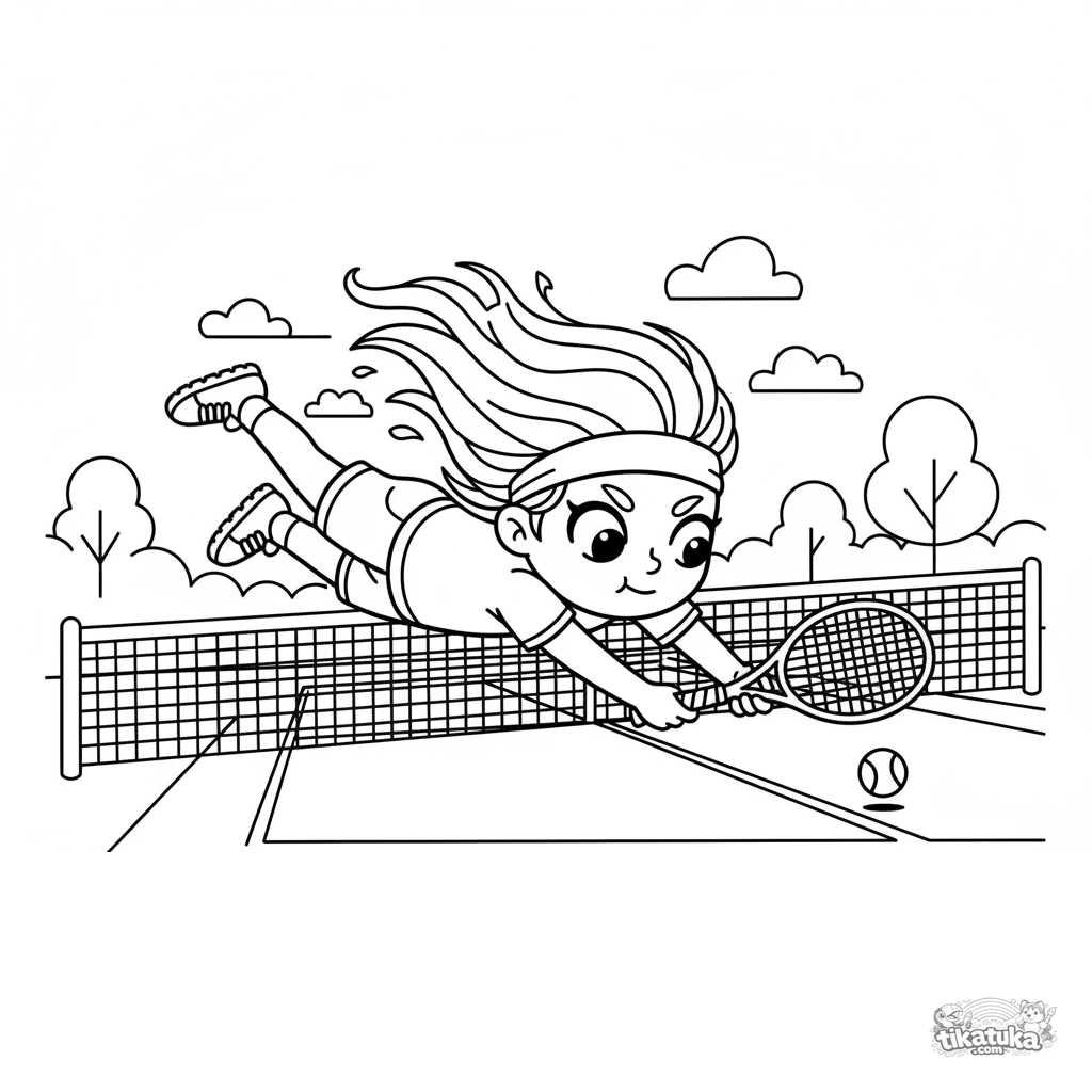 Ausmalbild für Kinder von 4-6 Jahren: Ein Tennisspieler im dynamischen Hechtsprung greift nach einem kniffligen Stoppball am Netz.