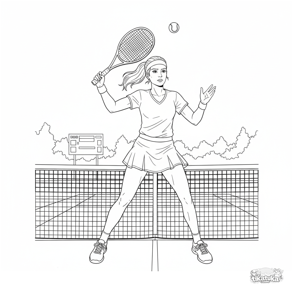 Ausmalbild für 10-12 Jahre: Tennisspieler in kraftvoller Aufschlaghaltung. Detaillierte Darstellung mit Schläger und Ball in Bewegung.