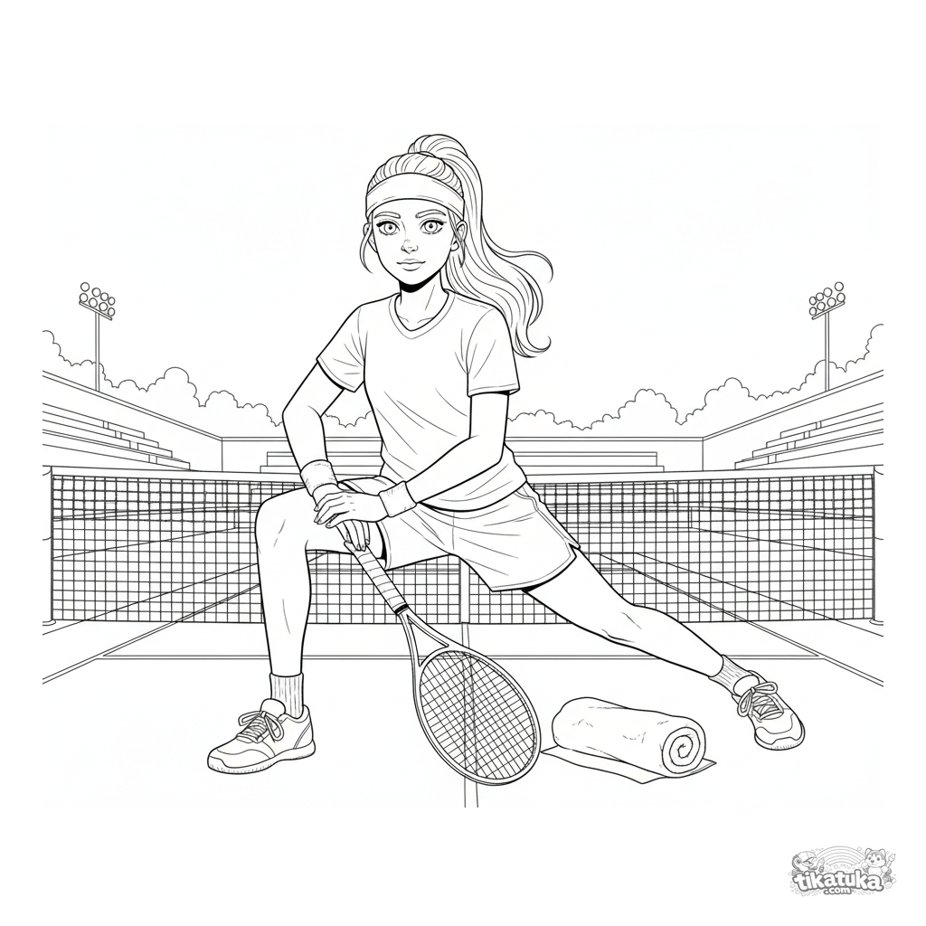 Detailliertes Ausmalbild für Kinder 10-12: ein jugendlicher Tennisspieler dehnt sich vor dem Match auf dem Platz. Details von Kleidung, Schläger, Handtuch und Linien.