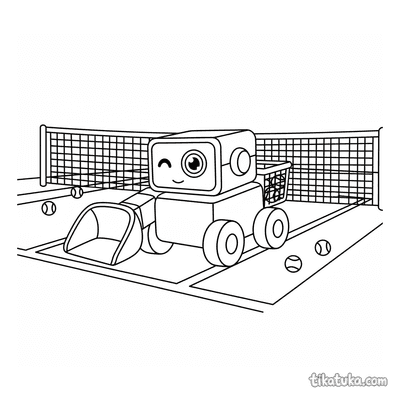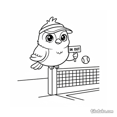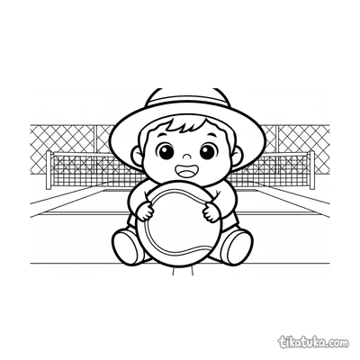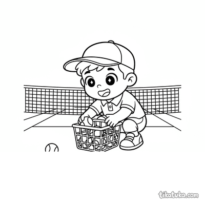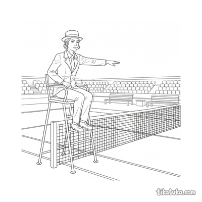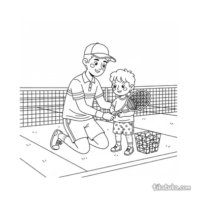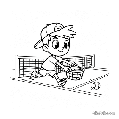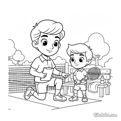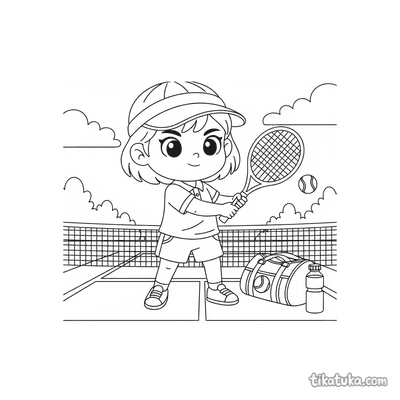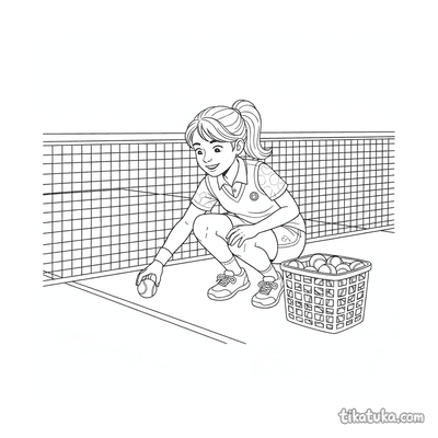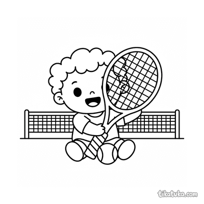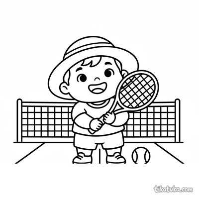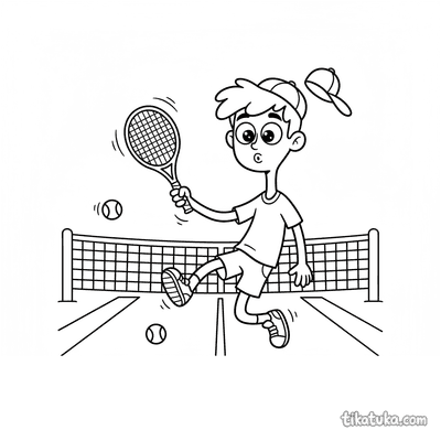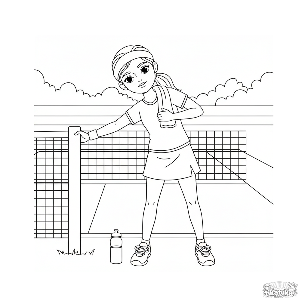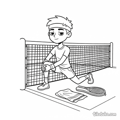 Ausmalbild für Kinder von 7-9 Jahren: Ein Tennisspieler dehnt sich am Netzpfosten. Ruhige Szene, saubere Linien im Aquarell-Skizzen-Stil.