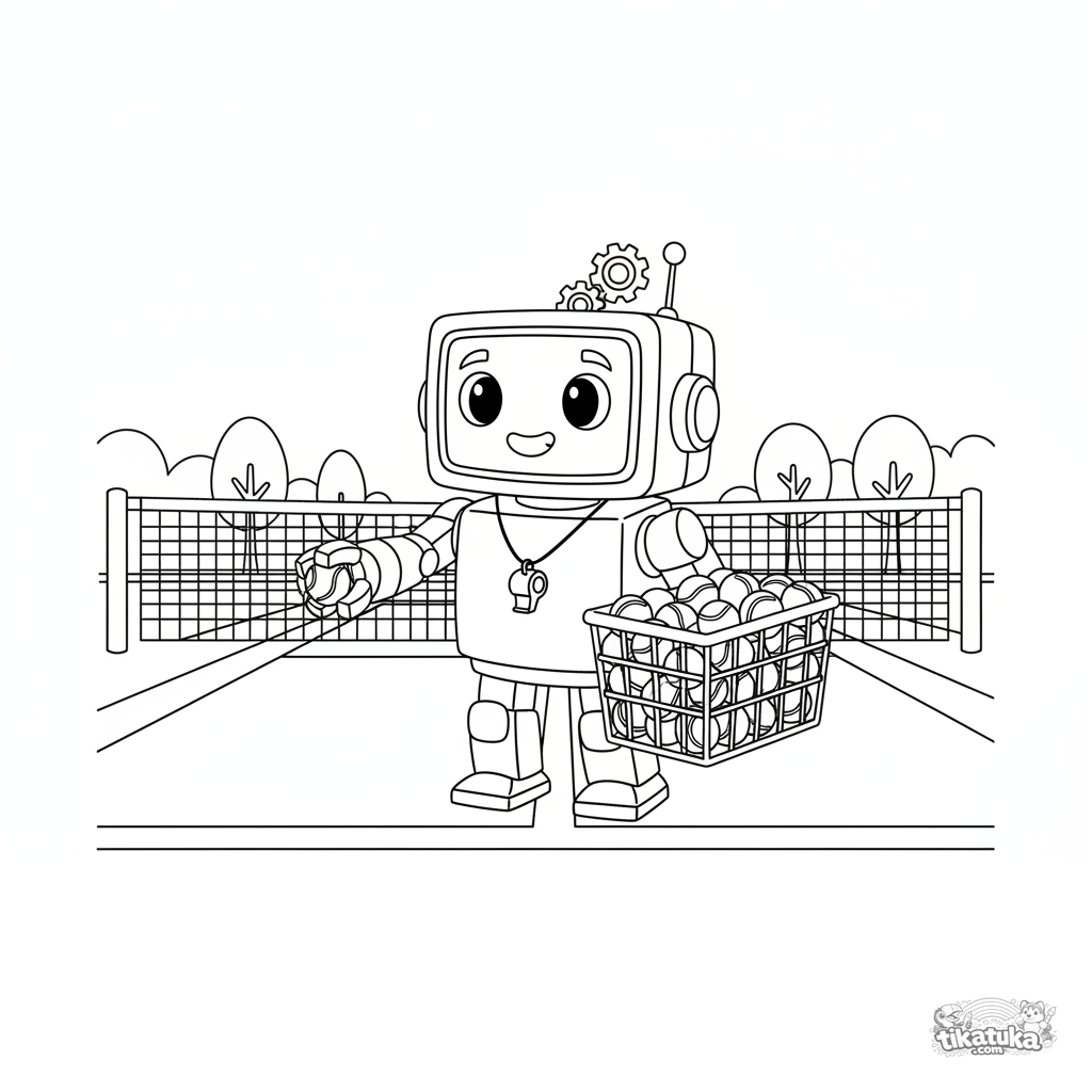Ausmalbild für 7-9 Jahre: ein freundlicher Roboter-Trainer auf einem Tennisplatz hält einen Korb mit Bällen. Lustige futuristische Szene.