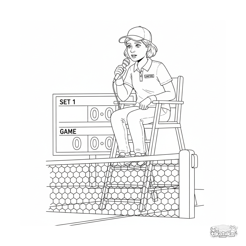 Ausmalbild für Kinder von 4-6 Jahren: Ein Schiedsrichter auf einem Tennisplatz sitzt auf einem hohen Stuhl und spricht in ein Mikrofon. Lehrreiche Szene.
