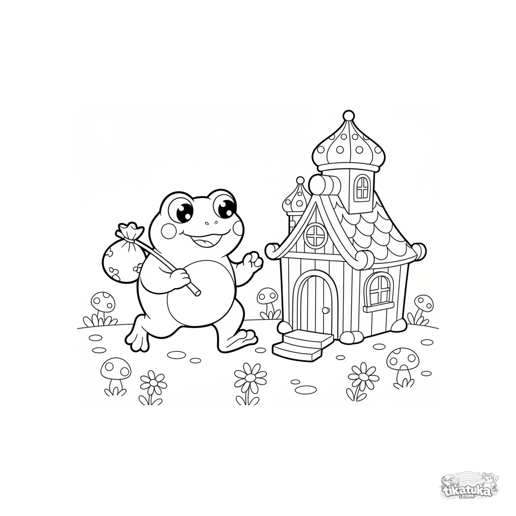 Einfaches Ausmalbild für Kleinkinder zum Märchen Teremok. Ein Frosch hüpft zum Häuschen auf der Wiese. Große Formen, dicke Umrisse, für 2-3 Jahre.