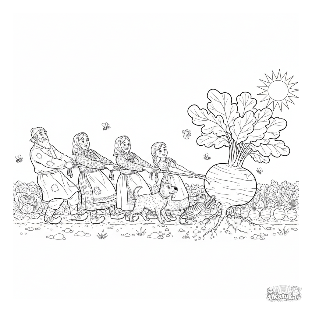 Ausmalbild zum russischen Märchen 'Die Gigantische Rübe', alle Figuren ziehen gemeinsam. Detaillierte Szene für ältere Kinder von 7-12 Jahren.
