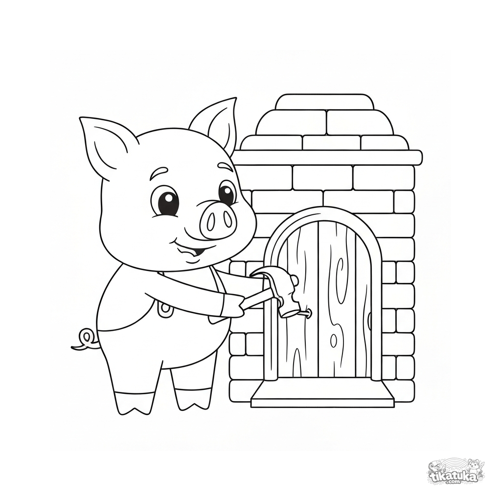 Ausmalbild für Kinder. Das dritte Schweinchen steht stolz bei seinem Backsteinhaus und hämmert einen großen Nagel in die Holztür. Kostenlos herunterladen.