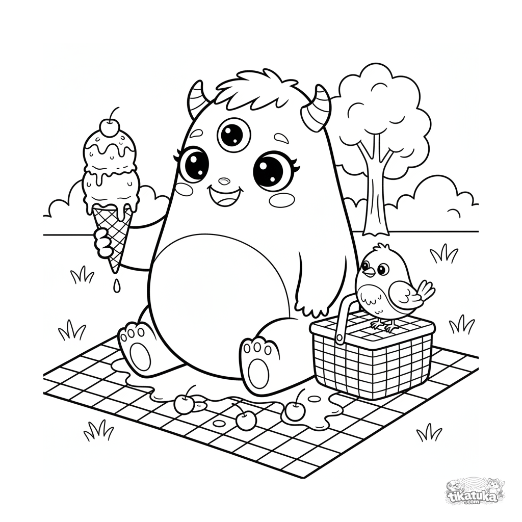 Freundliches Ausmalbild für Kinder: Ein dreiäugiges Monster teilt eine Eiscreme-Waffel mit einem Vogel auf einem Picknick. Szene über Freundschaft und Güte.