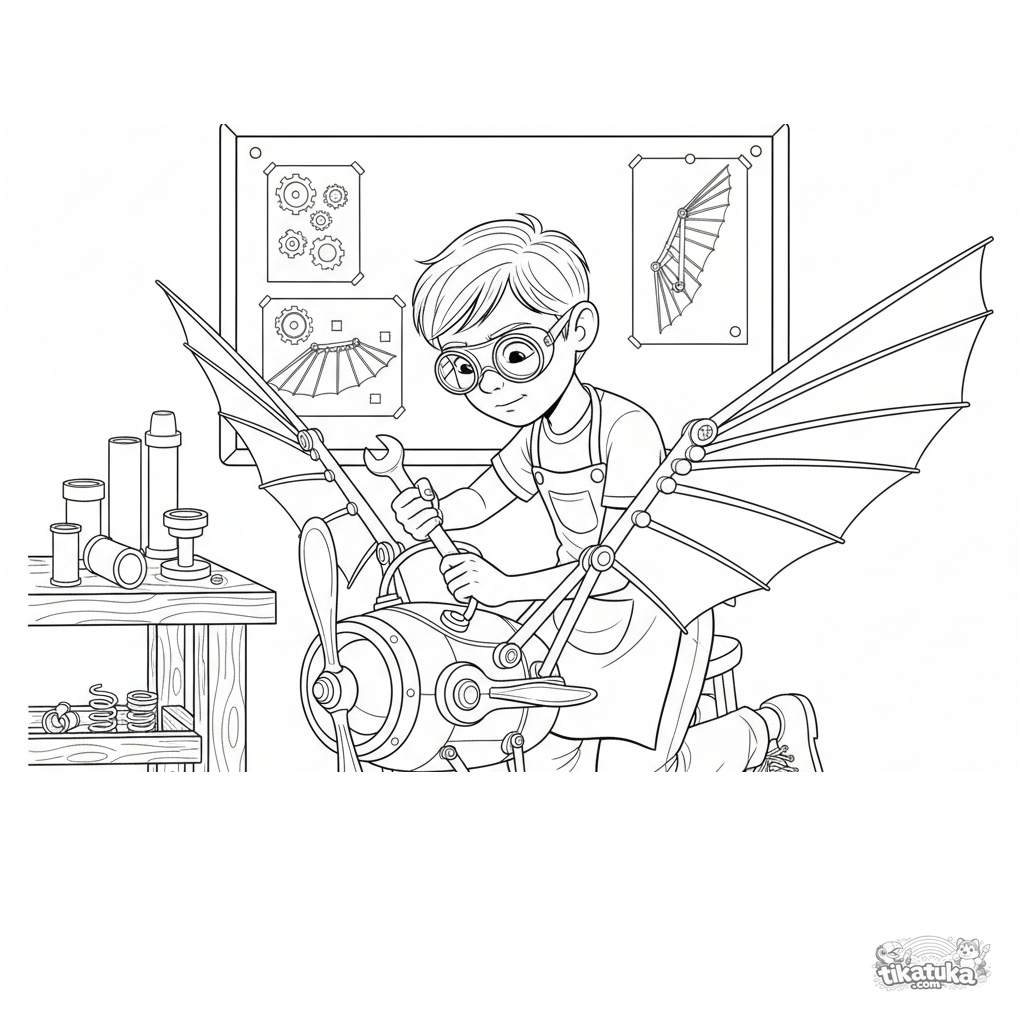 Ausmalbild für Tweens 7-9: Ein junger Bastler repariert in einem geheimen Labor Teile seiner skurrilen Steampunk-Flugmaschine.