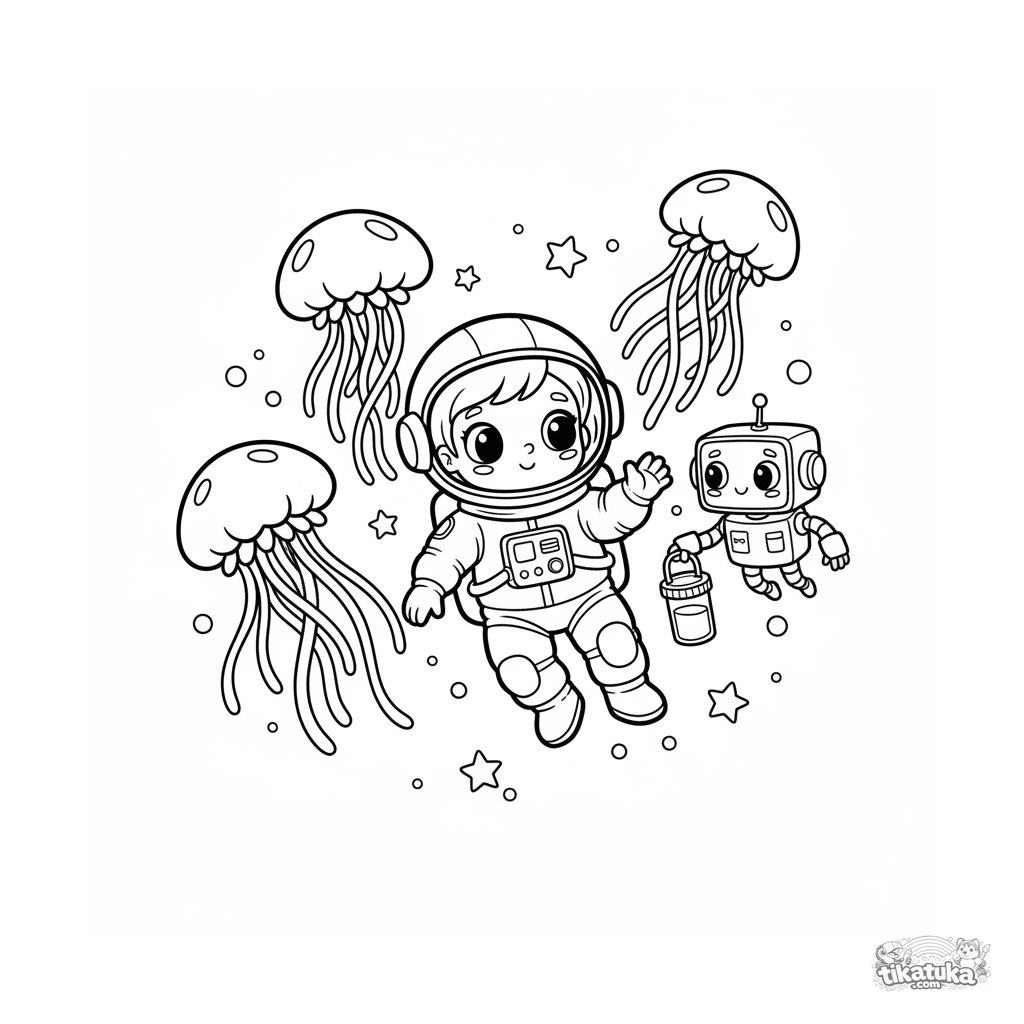 Ausmalbild für Kinder 4-6: Ein winziger Astronaut schwebt zwischen Sternen und trifft auf leuchtende Weltraumquallen. Niedliche und sanfte Szene zum Ausmalen.