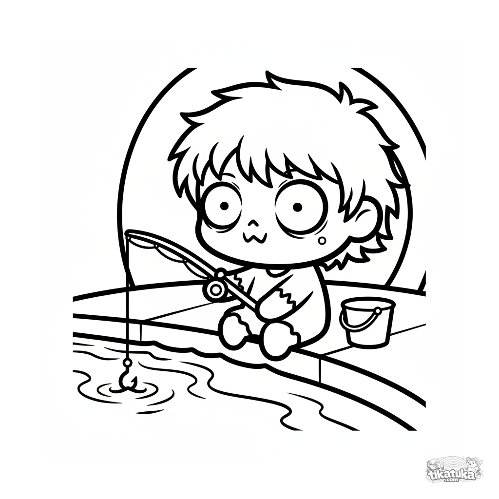 Einfaches Ausmalbild für Kleinkinder 2-3: ein süßer Chibi-Zombie sitzt mit einer Angelrute an einem Bach im Abwasserkanal. Große Formen, wenige Details.