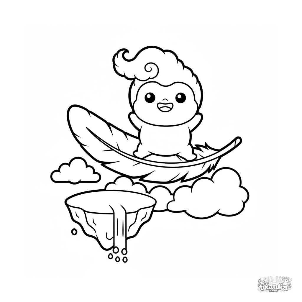 Einfaches Ausmalbild für Kleinkinder 2-3: Eine winzige Wolkenfee reitet auf einer Feder über den Himmel. Große einfache Formen, breite Ränder zum Ausmalen.