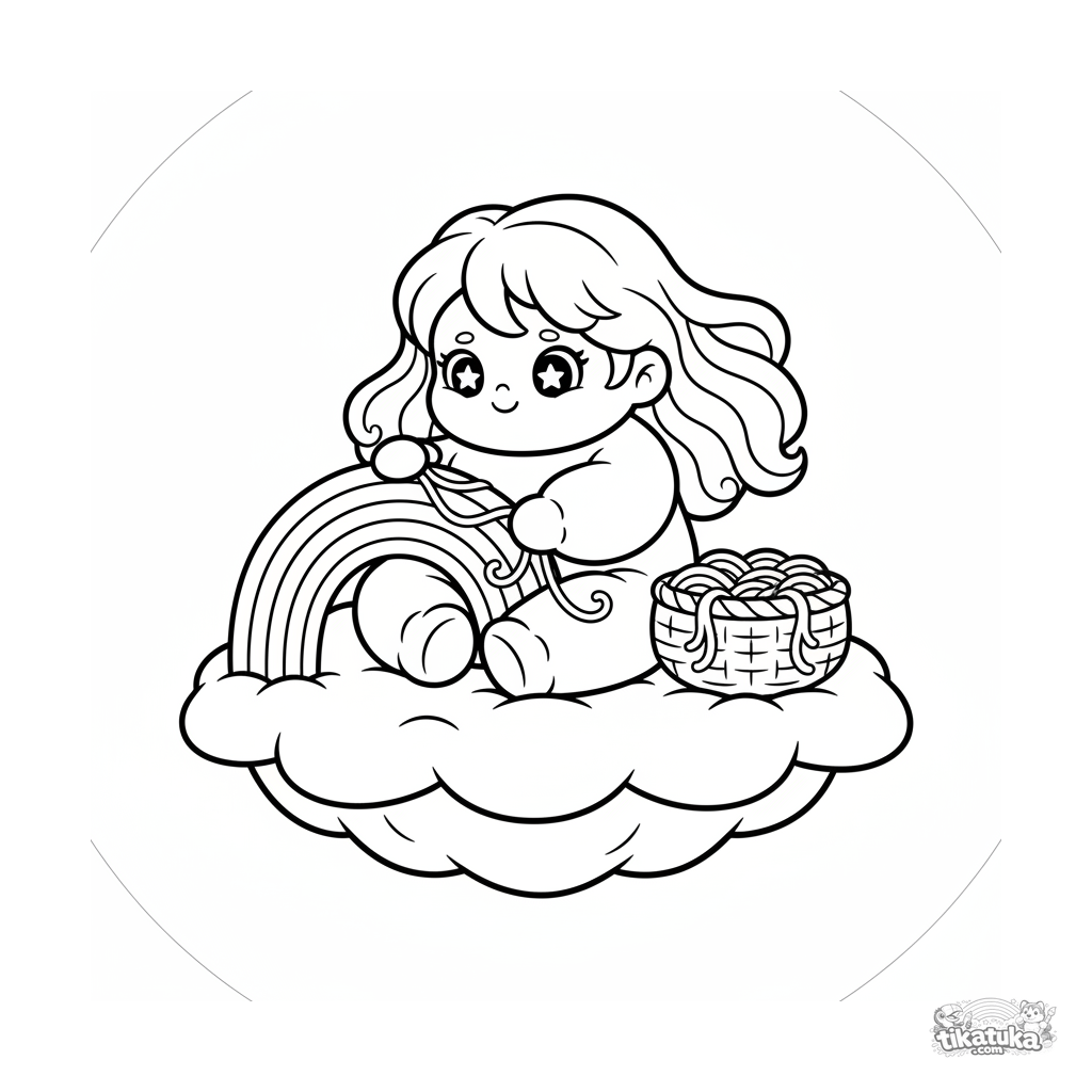 Einfaches Ausmalbild für Kleinkinder 2-3: Eine flauschige Wolkenfee webt einen kleinen Regenbogen auf einer weichen, schwebenden Wolkeninsel.