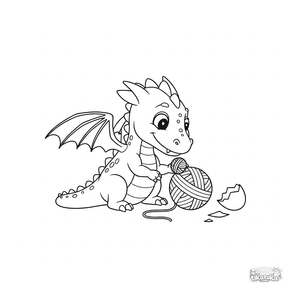 Ausmalbild für Kleinkinder: Ein süßes Drachen-Baby spielt mit einem Wollknäuel. Einfache realistische Zeichnung mit klaren Umrissen.