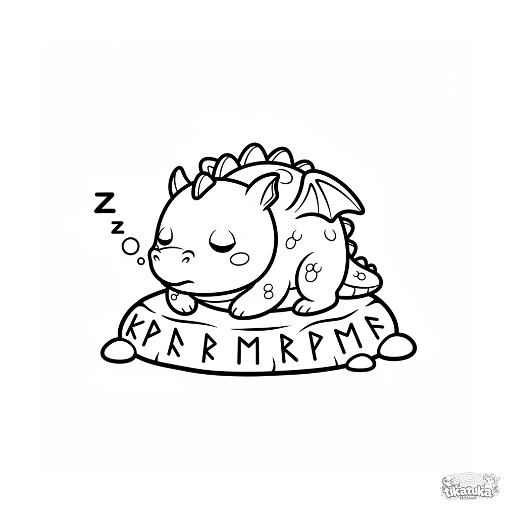 Einfaches Ausmalbild für Kleinkinder: ein winziger Drache schläft auf einem alten Runenstein. Große Formen, wenige Details. Für Kinder von 2-3 Jahren.