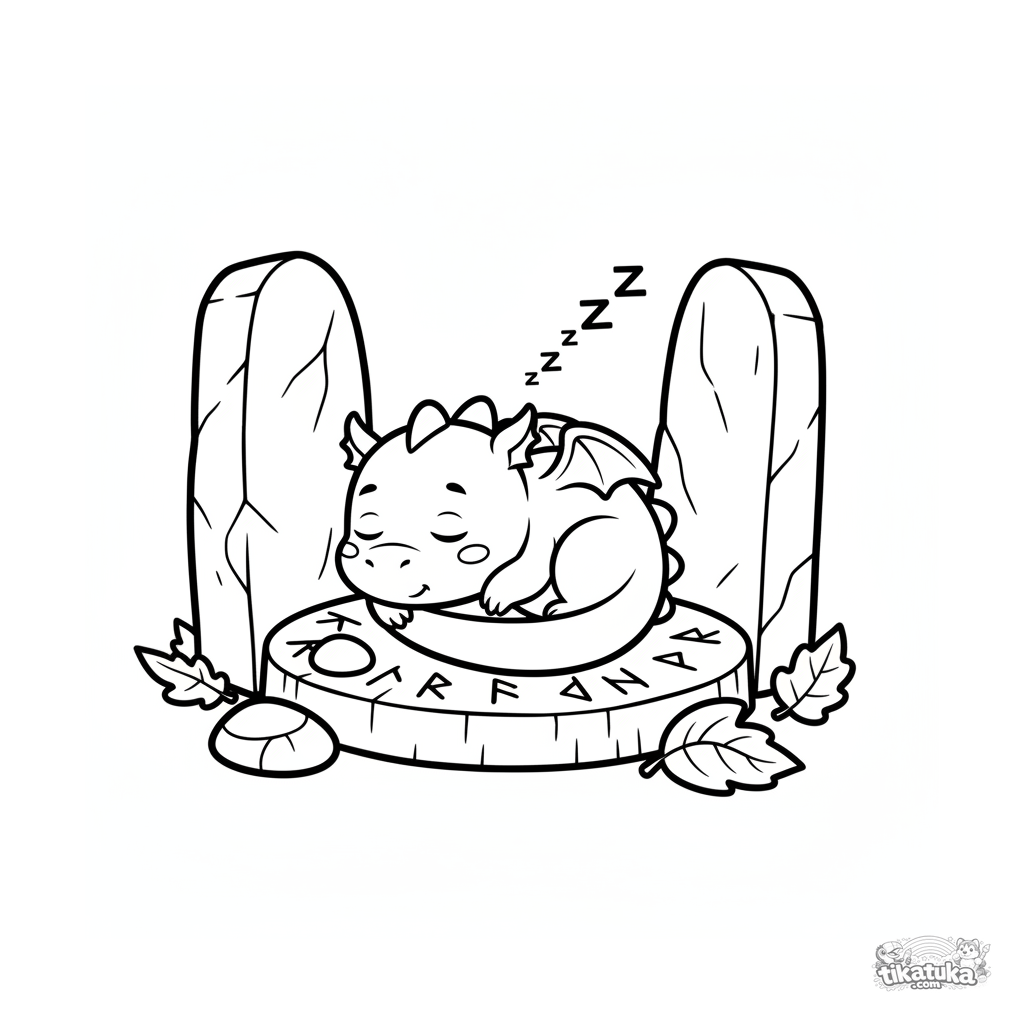 Ausmalbild für Kleinkinder 2-3 Jahre: ein winziger Drache schläft fest, zusammengerollt auf einem Runenstein. Einfache, große Formen.