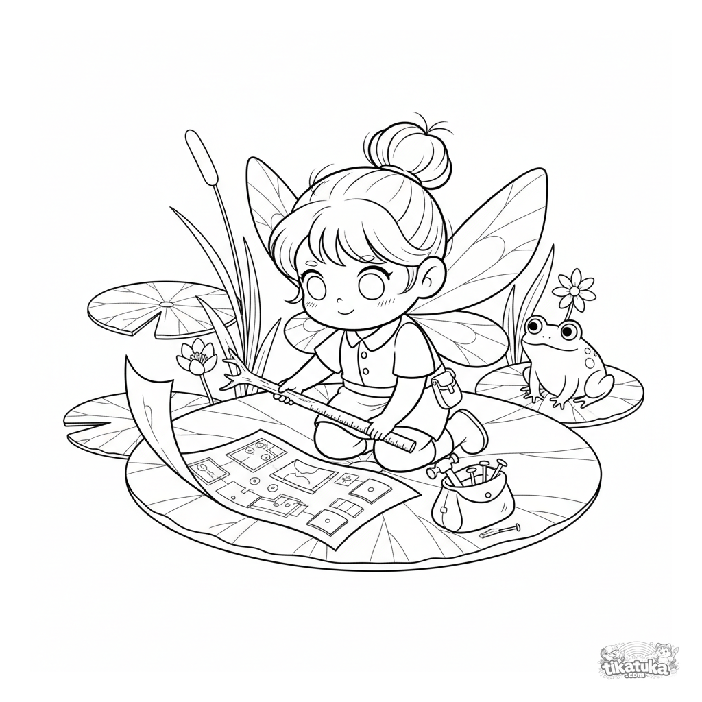 Ausmalbild für 7-9 Jahre: eine winzige Fee-Architektin zeichnet detaillierte Pläne auf einem großen Seerosenblatt. Niedliche, detaillierte Fantasie-Teichszene.